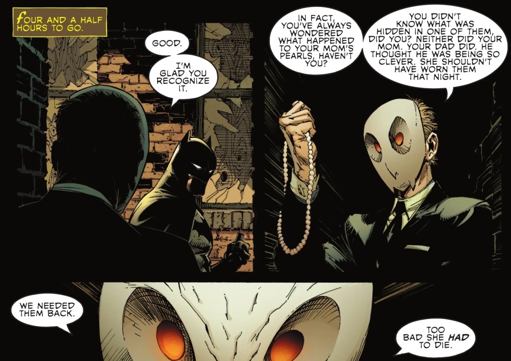 Easily the weakest element of the entire one shot are the main villains. One, a random leader of the Court of Owls, and the other a talon (an undead solider for the Court of Owls). The icing on the cake of the sporadic plotting is the fact that a pearl in Batman’s mother’s necklace holds the soul of Wanda Blake, Spawns lover. If that mouthful of a sentence is as confusing as it sounds, you’re not alone. Even if you’re familiar with both of these characters and their supporting casts, this plotline being the reason for Batman and Spawn to crossover into each other’s worlds is just baffling, and leaves plot holes left and right when you actually think of all the inconsistencies of why this isn’t very plausible. Long story short it’s confusing and makes little to no sense. Which in turn dampens the affect of such characters coming face to face. How can we as an audience care about such a monumental crossover, if the reasoning for both characters meeting is nonsensical and half baked.