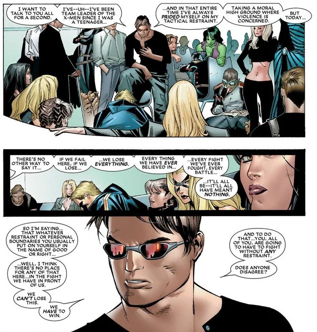 With Wolverine’s team fully assembled, they take the fight straight to Scarlet Witch, but not before X-Men member, Cyclops, gives a rousing speech that would make even Captain America blush. With his red reflective shades seducing the readers eyes, Cyclops goes on to explain that holding back is not an option. With every punch thrown, every drop of blood, keep fighting no matter what, because if we lose this battle, we lose everything. It’s a moment that would give even casual fans goosebumps and helps to exemplify just how much is at stake. Not to mention, it being completely badass.